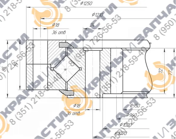 ОПУ ОПРУ-1250.10.24.00 36 выполнено в виде массивного роликового подшипника с внутренним зубчатым краем (96 зубьев, модуль 10, высота зуба 72 мм). Устройство изготовлено из конструкционной стали 50Mn с твердостью HB230-280, обеспечивающей высокую износостойкость и низкую хрупкость. Зубья закалены для повышения прочности и устойчивости к нагрузкам. Устройство крепится к неповоротной платформе с помощью 36 высокопрочных стальных болтов класса не ниже 10.9 (затяжка крест-накрест с моментом 400-450 Нм для М20). Для защиты дорожек качения применяются резиновые уплотнительные манжеты, а смазка подается через пресс-масленки. Конструкция выдерживает значительные нагрузки, но неравномерное распределение сжимающих усилий, не погашенных аутригерами, может привести к износу зубьев.