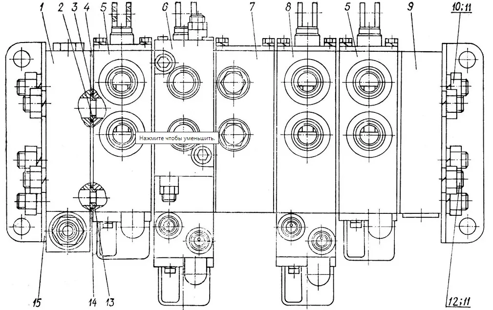 Составляющие: 1- входная секция, 2,13 - бандаж, 3,14 - резиновое кольцо, 4 - уплотнитель, 5 - рабочая секция, 6,8 - камера с управлением блоком предохранительных дросселей, 7 - промежуточный сегмент с обратными дросселями, 9 - слив, 10,12 - шпильки, 11 - гайки, 15 - угольник.
