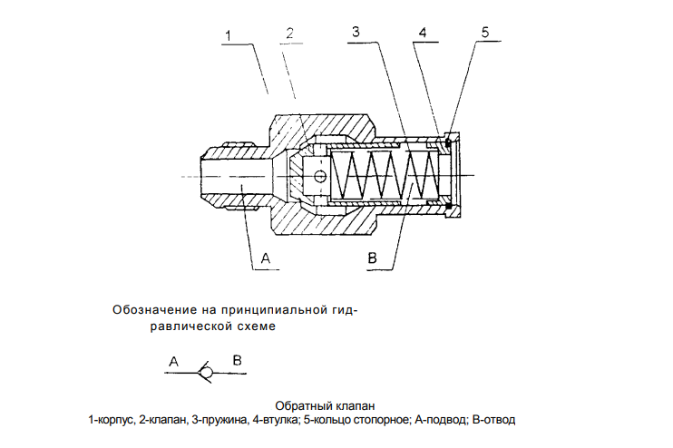 Подводимый к отверстию А поток рабочей жидкости открывает клапан 2, преодолевая усилие слабой пружины 3, и через радиальные отверстия клапана 2 проходит к отверстию В. Движение рабочей жидкости от отверстия В к отверстию А исключено, так как клапан 2 прижмется к седлу корпуса 1 пружиной 3 и давлением поступающим к отверстию В рабочей жидкости. Направление потока помечается на корпусе клапана стрелкой.