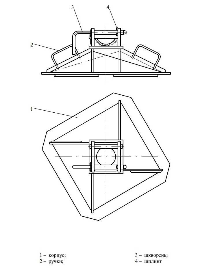Подпятники предназначены для установки под каждую из четырех гидроопор вывешивания крана в рабочем положении, что обеспечивает равномерное распределение нагрузки, которая передается от штоков гидроопор через подпятники на основание рабочей площадки. Подпятник представляет собой жесткий сварной корпус 1 (см. рисунок), в сферическое углубление которого упирается головка штока гидроопоры при установке крана на выносные опоры. Подпятник снабжен шкворнем 3 для фиксации его на штоке гидроопоры. В целях удобства перемещения подпятник имеет ручки 2.