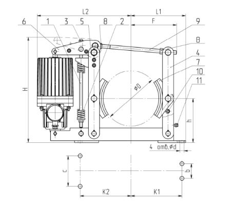 При установке тормозных механизмов данного типа необходимо выдерживать вертикальное положение устройства (с расположением оси тормозного шкива и основания крепления тормозного устройства в горизонтальной плоскости).