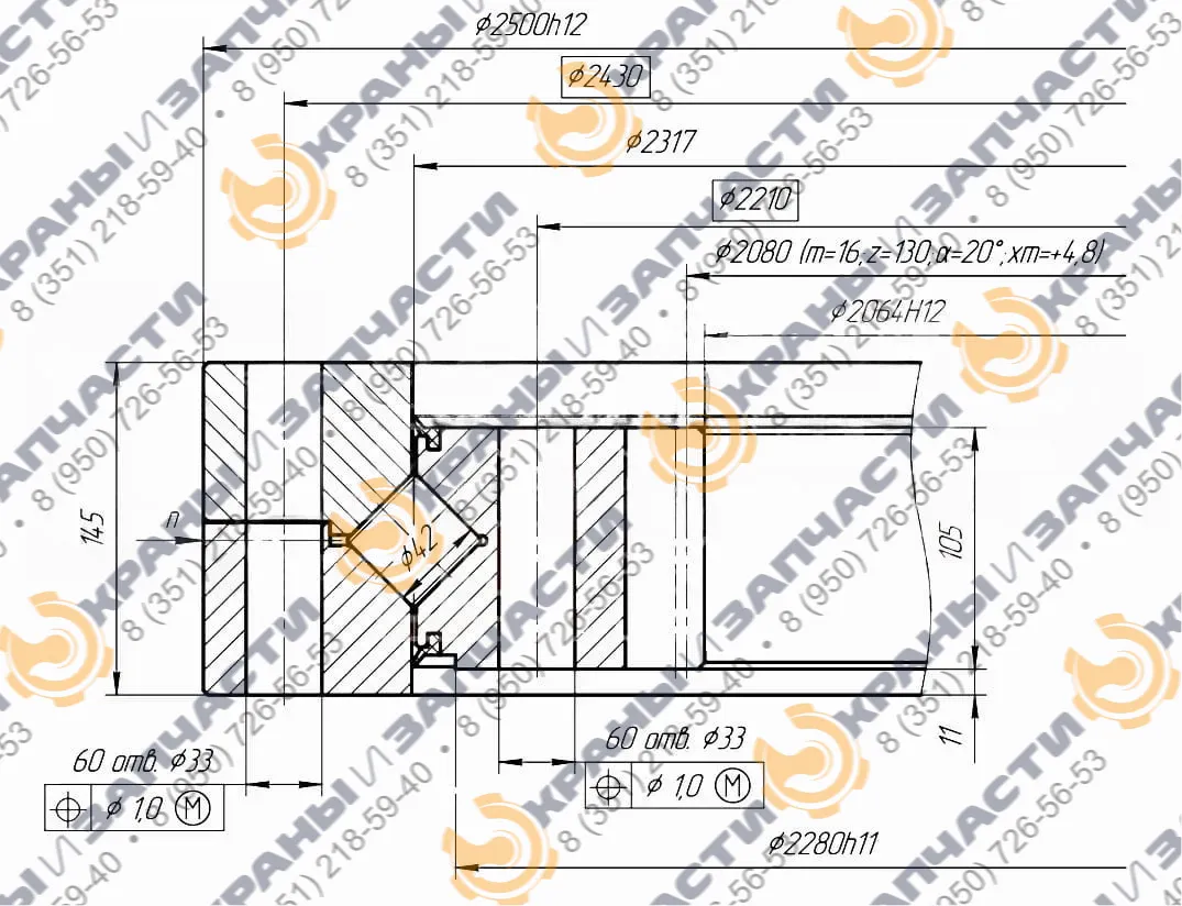 ОПУ-2500.3.2.16.3Р У1 состоит из двух кругов-полуобойм, между которыми расположены ролики. Внутренний край имеет 130 зубьев с модулем m=16, предназначенных для зацепления с выходной шестерней редуктора, обеспечивая вращение башни. Опорно-поворотное устройство изготовлено из конструкционной стали 50Mn с высокой износостойкостью и низкой хрупкостью. Зубчатый край закален для повышения прочности. Монтаж осуществляется высокопрочными болтами класса не ниже 10.9, затяжка производится крест-накрест для устойчивости. Устройство оснащено пресс-масленками для смазки роликов и дорожек качения (рекомендуется пластичная смазка Литол-24 по ГОСТ 21150-87). ОПУ ремонтопригодно: возможна замена роликов, уплотнительных манжет и восстановление геометрии зубьев.